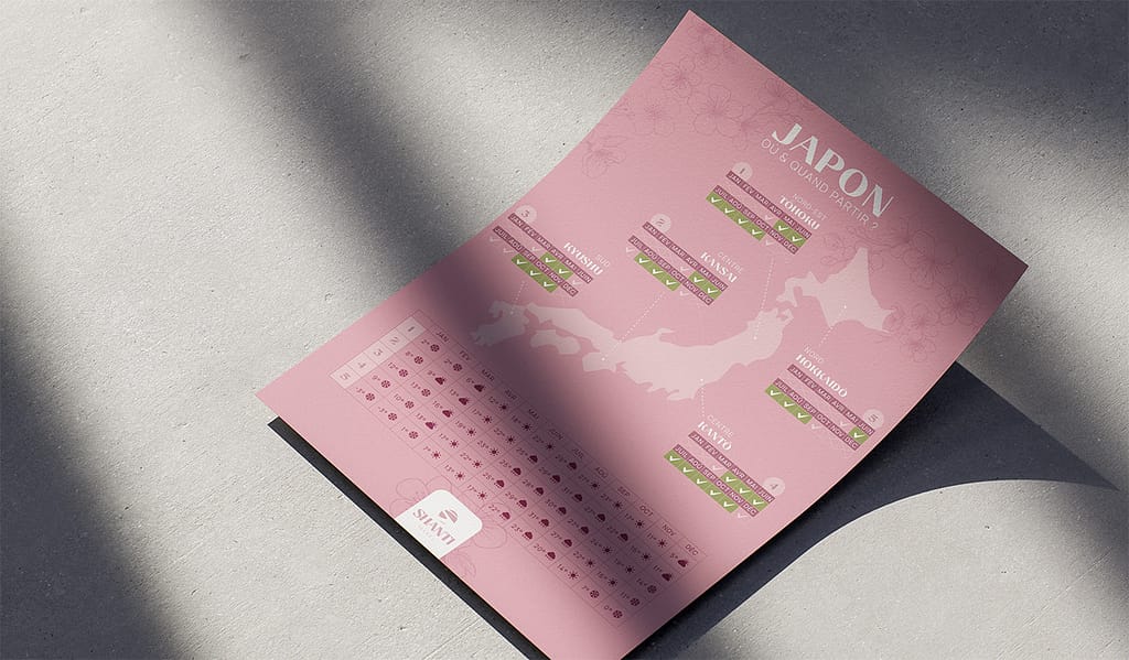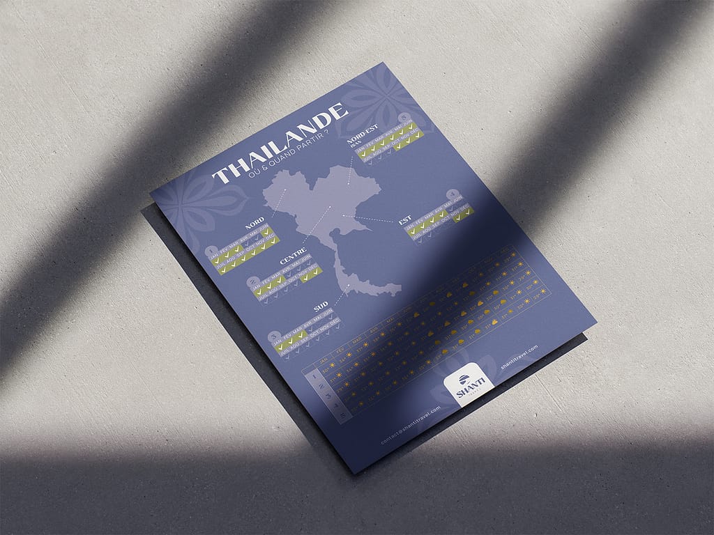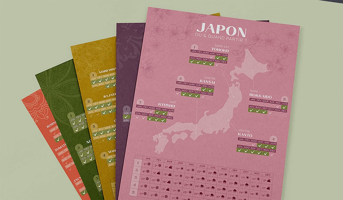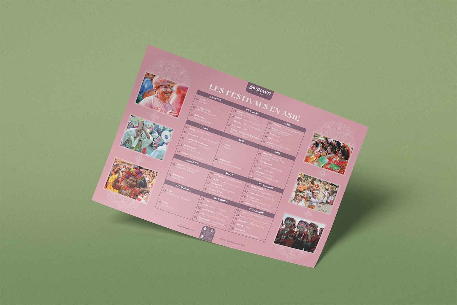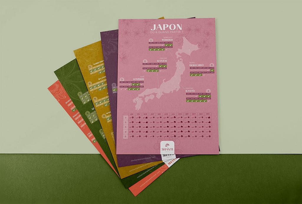 Conception et réalisation d’une collection de flyers pour l’agence de voyage Shanti Travel, spécialiste des voyages en Asie.