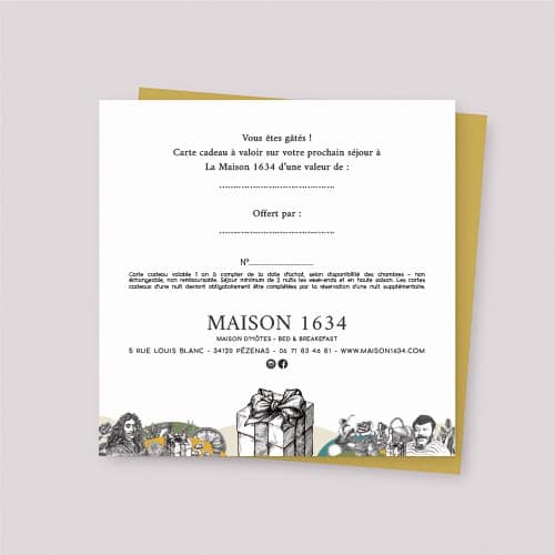 Conception et réalisation d’une carte cadeau pour Maison 1634, chambres d’hôte de charme à Pézenas.